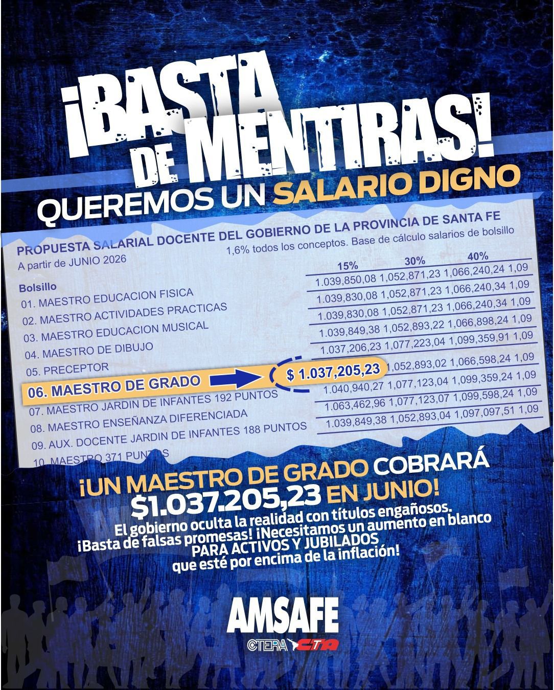 «Desde AMSAFE rechazamos las declaraciones del Gobierno provincial que intentan instalar que Santa Fe tendrá “uno de los mejores salarios docentes del país”. Esa afirmación es falsa y busca confundir a la sociedad y a la comunidad educativa. La verdad está escrita en el propio acta paritaria presentada por el Ministerio de Educación, donde se detalla que un maestro de grado en junio percibirá $1.037.205,23 muy lejos de los valores que el Gobierno comunica mediáticamente», arranca diciendo el documento.