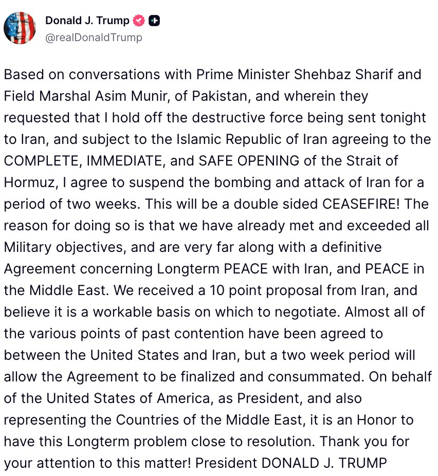 «Sobre la base de conversaciones con el primer ministro Shehbaz Sharif y el mariscal de campo Asim Munir, de Pakistán, y dado que me solicitaron que frenara la fuerza destructiva que iba a ser enviada esta noche contra Irán, y sujeto a que la República Islámica de Irán acepte la APERTURA COMPLETA, INMEDIATA y SEGURA del estrecho de Ormuz, acepto suspender el bombardeo y el ataque contra Irán por un período de dos semanas.