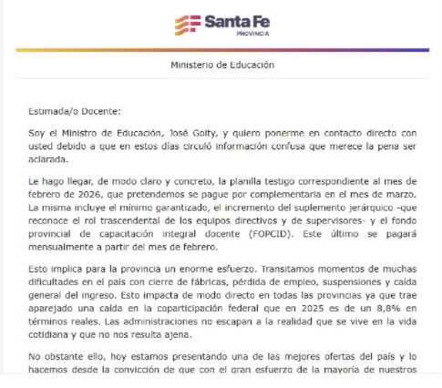 Tras el rechazo de todos los gremios docentes a a la suba salarial propuesta por el gobierno de Santa Fe, y el anuncio de un paro para el 2 de marzo, el ministro de Educación de la provincia, José Goity, les envió una carta por mail a todos los maestros. En el texto, que da detalles de la propuesta y tiene adjunta la planilla de aumentos, sostiene que los docentes con jornada extendida cobrarán $1.305.310,91 en febrero.