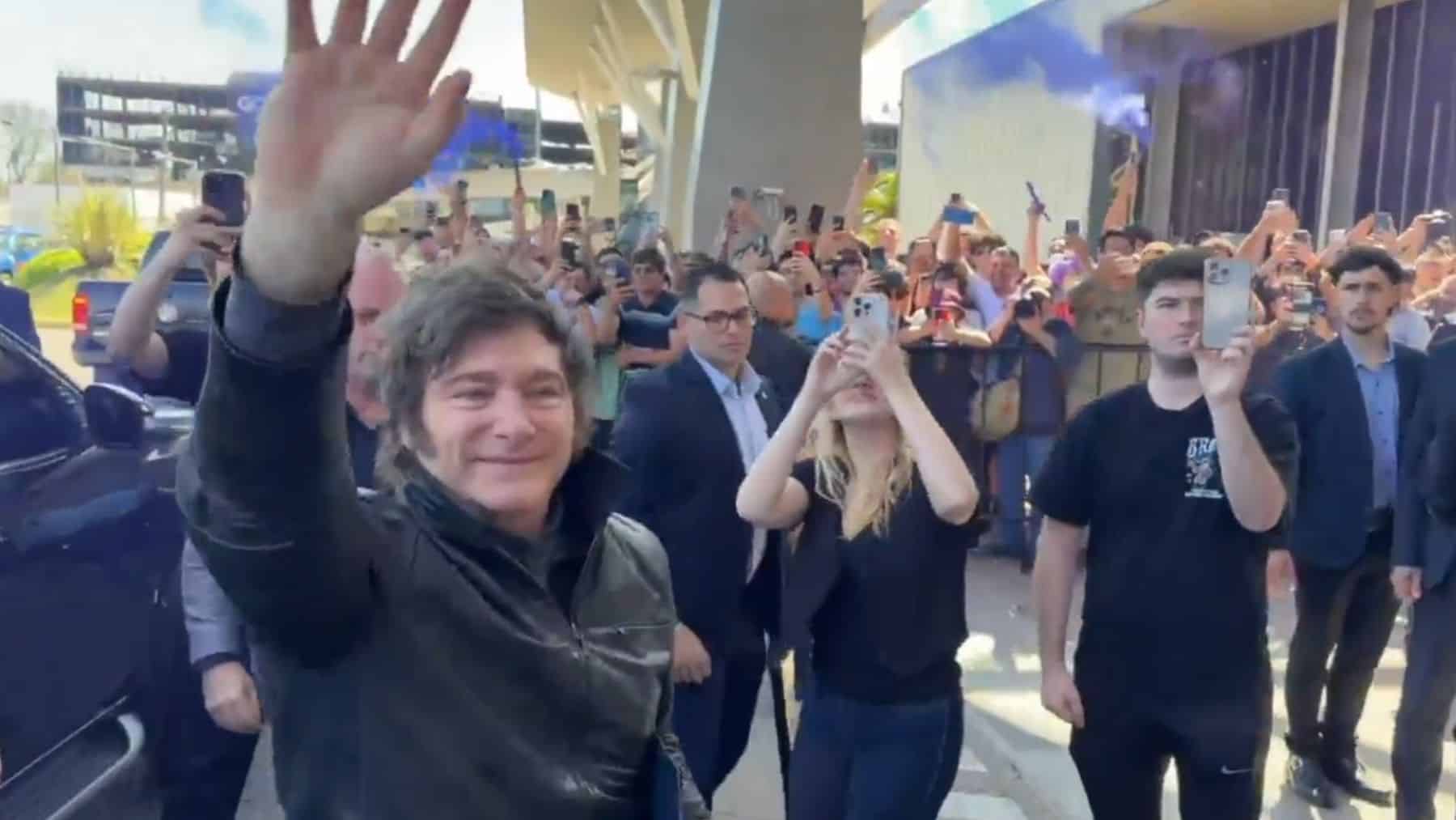 Después de reunirse con dirigentes locales en el hotel, Milei se fue en medio de la euforia desbordante de sus partidarios que, entre empujones, intentaban llegar al presidente para tocarlo o abrazarlo. Sin embargo, a poco metros de la puerta principal, también arribaron manifestantes opositores que se trasladaron para protestar contras sus políticas.