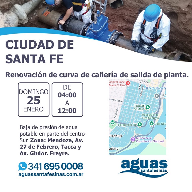 En el marco del plan de mantenimiento y confiabilización de las instalaciones de la planta potabilizadora, la empresa Aguas Santafesinas S.A. (ASSA) informó que el próximo domingo habrá baja presión en el suministro de agua potable en la zona sur de la ciudad de Santa Fe. Se debe a la realización de trabajos para reemplazar una curva de una de las cañerías primarias de salida de la planta hacia el sur.