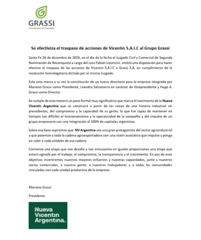 El juez en lo Civil y Comercial de Reconquista, Fabián Lorenzini, emitió hoy la resolución que hace efectivo el traspaso de las acciones de Vicentín a Grassi S.A., tras el acuerdo con los acreedores homologado por el magistrado días atrás. Este acto, constituye el nuevo directorio de la empresa, que pasa a llamarse Nueva Vicentín Argentina (NV Argentina)