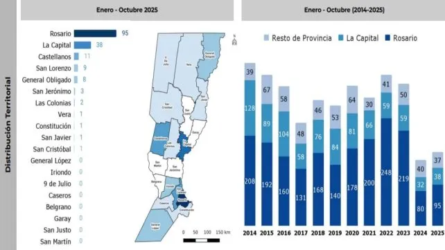 Del total acumulado en el año, el 26% de los crímenes ocurrieron en la ciudad de Santa Fe y alrededores. Según el último reporte oficial del Observatorio de Seguridad Pública, dependiente del Ministerio de Seguridad, 38 homicidios fueron en las localidades del Gran Santa Fe. En términos territoriales, el departamento La Capital continúa siendo el segundo con mayor cantidad de hechos violentos, detrás de Rosario, que concentra más del 55% del total provincial.