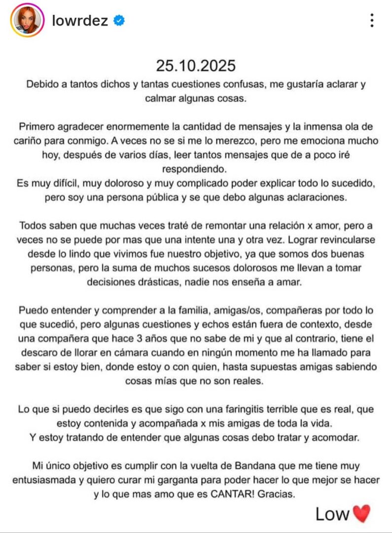 Posteriormente, la artista se refirió a quienes hicieron las denuncias, aunque sin mencionarlas, como es el caso de su mamá o de su compañera de Banda, Lissa Vera. “Puedo entender y comprender a la familia, amigas/os, compañeras por todo lo que sucedió, pero algunas cuestiones y hechos están fuera de contexto, desde una compañera que hace tres años que no sabe de mí y que al contrario, tiene el descaro de llorar en cámara cuando en ningún momento me ha llamado para saber si estoy bien, dónde estoy o con quién, hasta supuestas amigas sabiendo cosas mías que no son reales”, disparó.