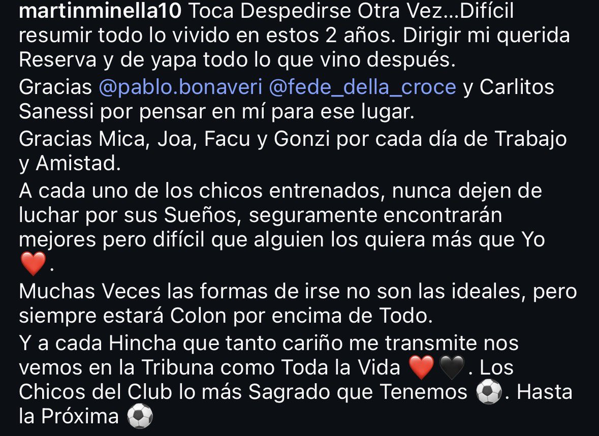 El entrenador, que tuvo la chance de dirigir un puñado de partidos al plantel profesional durante la última temporada de la Primera Nacional, agradeció a los simpatizantes rojinegros: «A cada hincha que tanto cariño me transmite, nos vemos en la tribuna como toda la vida». También aprovechó para dedicarle unas palabras a los futbolistas de inferiores. «A cada uno de los chicos entrenador, nunca dejen de luchar por sus sueños, seguramente encontrarán mejores, pero difícilmente que alguien los quiera más que yo», expresó Minella.