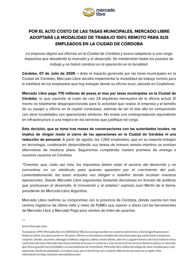 El documento informa que «por el alto costo de las tasas municipales», desde agosto, Mercado Libre dejará sus oficinas en la capital cordobesa y los 1.260 empleados que hoy trabajan en la oficina del edificio Capitalinas continuarán desarrollando sus tareas de manera remota.
