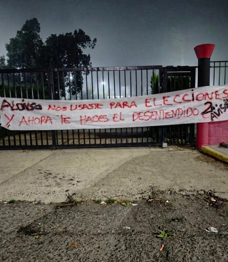 25-04-2026 Colón Otra bandera amenazante contra el presidente de Colón Fue colgada esta madrugada en el acceso norte al estadio Brigadier López.