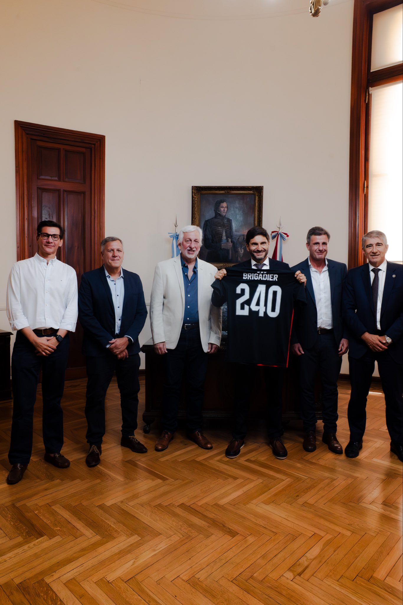 En el caso de Unión, el presidente Luis Spahn le entregó al gobernador la camiseta alternativa del Tate cuyo diseño fue inspirado en el uniforme de los “Dragones de la Independencia” que custodiaban a López.
