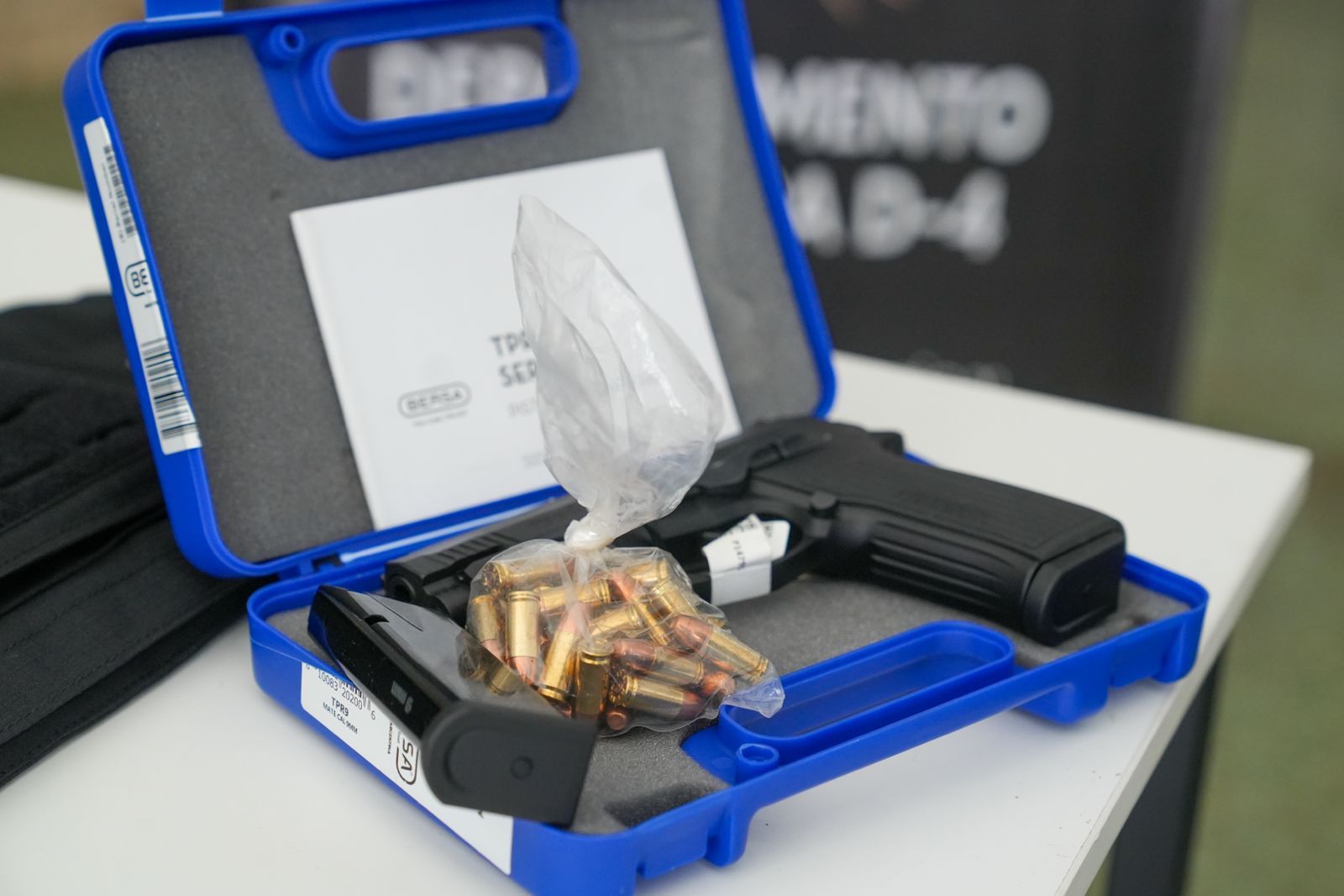 El equipamiento entregado a estrenar comprende una pistola Bersa 9 mm de doble acción como arma reglamentaria, chaleco balístico y uniforme de fajina completo.