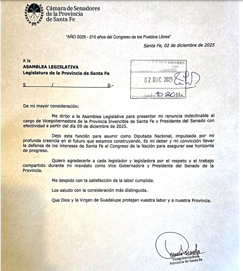 Gisela Scaglia transita sus últimas horas como vicegobernadora de Santa Fe. De hecho, ya ingresó en la Legislatura provincial la nota en la que presenta su renuncia al cargo, la cual será aceptada por la Asamblea Legislativa convocada para el jueves 11 de diciembre.
