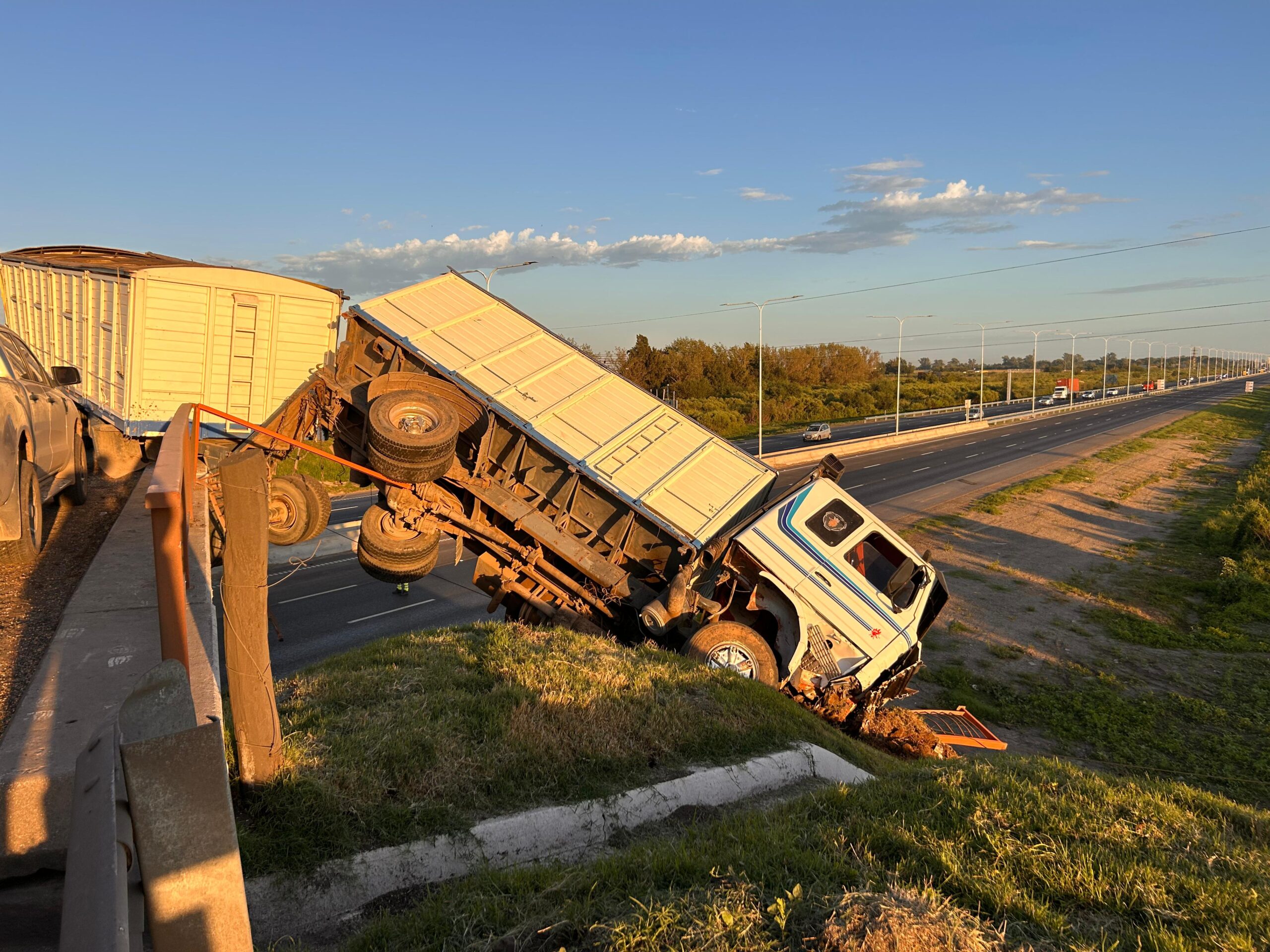 El camión terminó volcando contra las vallas del puente de ingreso a San Lorenzo, quedando la cabina colgando. Según explicaron algunos testigos, tras pasar por un bache “se trabó la dirección”. Pese a la espectacularidad del accidente , el chófer está fuera de peligro.